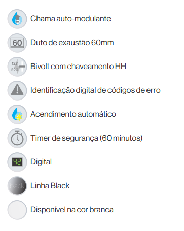 | Comprimento e número de curvas da chaminé | 2,5m com 1 curva (ajustável para 7m com 3 curvas via chaveamento, consulte uma assistência técnica credenciada) | ||