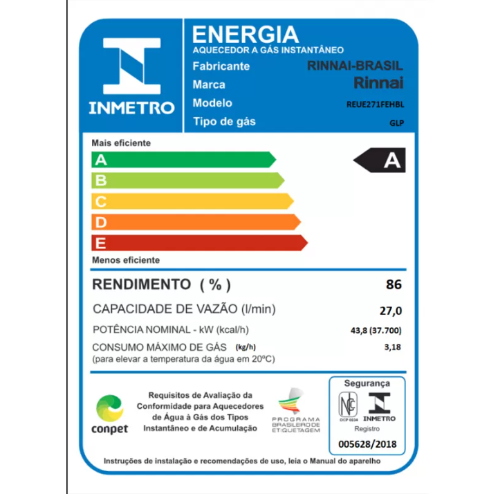 | Observações | (*) O termo de garantia constante no manual deve ser consultado para as condições de validade da cobertura. Indicado apenas para instalação residencial. Não utilizar em aplicações comerciais/industriais, locais móveis (motor homes por exemplo) aquecimento de piscinas (mesmo com troca indireta) ou sistemas para o atendimento de múltiplas unidades residenciais. A utilização para aquecimento de reservatórios (sistemas conjugados, apoio solar) é permissível somente para os modelos REU-E271 FEH, neste caso a garantia passa a ser de 1 ano, guardado que sejam observadas as determinações do manual e que o tempo de funcionamento diário não ultrapasse 4 horas. Os dados de vazão do aparelho correspondem ao desempenho em condições apropriadas de instalação hidráulica, gás de referência, com pressurização adequada e Δ20ºC, podendo haver variações. Aparelhos a gás devem ser instalados somente por profissionais devidamente qualificados, em conformidade com a ABNT NBR 13103. Contate uma Assistência Técnica Credenciada. | ||